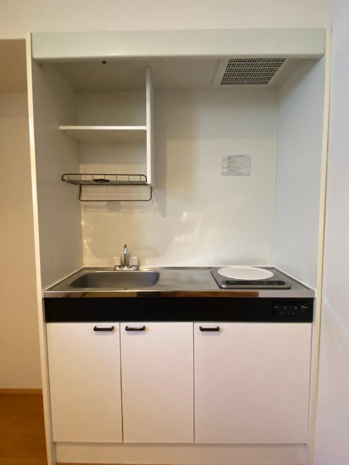 システムキッチン1口コンロ。シンプルながら調理スペースもしっかり確保。自炊派にも◎