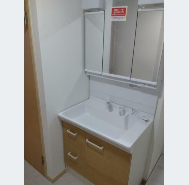 独立洗面台は朝の準備に便利。鏡裏収納付きで、生活感を隠せるのもポイントです。